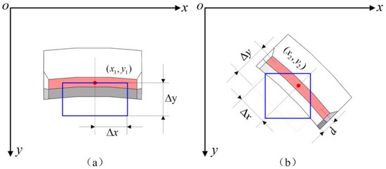 where (X,Y) and (X’,Y’) represent the top-left and bottom-right vertex coordinates of the target region, (xi, yi) represents the feature point coordinates of the ROI, gix, and giy represent the relationship between a vertex and feature points, and hix and hiy represent the relationship between another vertex and feature points, respectively. By using the designed dimensions as a reference and defining a rectangular area, we can establish the relationships between the feature points and the rectangular region in the vertical and oblique directions, as shown in Figure 10a,b, respectively. Assume that Δx and Δy are the values that are set in light of the designed dimensions, and d represents the distance from the feature point to the tangent line of the inner arc. The origin coordinates of the ROI can be obtained from the relationships Δx, Δy, and d, which are listed in Table 1.