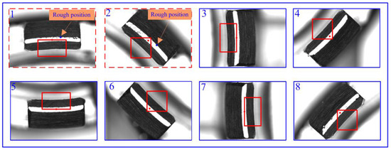 The ROI extraction result of a typical part is shown in Figure 11. It is worth noting that the feature images of arc segments 1 and 2 cannot directly extract feature points due to noise. However, their feature points can be obtained by first acquiring their rough position from the CAD model and then refining it using the method of connected region detection.