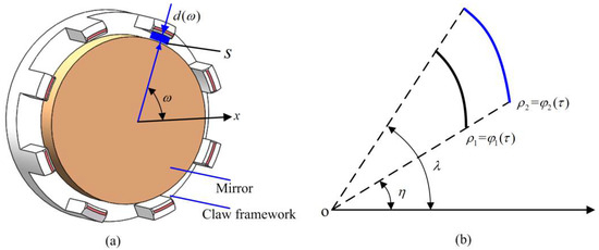 To facilitate the calculation, the data for the mirror and eight-section arcs were converted to polar coordinates. As shown in Figure 13b, the functions of the two parts are described as ρ1 = φ1(τ) and ρ2 = φ2(τ) in polar coordinates, and their angles with respect to the polar axis are η and λ, respectively. Thus, the fit clearance value between an arc of the claw framework and a mirror is: