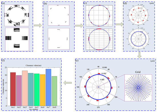 Flowchart of calculating the assembly fit clearance values: (a) Experimental image of parts; (b) Extract the target edges of the images; (c) Calculate centers using the least square fit; (d) Convert to polar coordinates; (e) Calculate the assembly alignment position based on uniformity assembly using grid search; (f) Calculate the mean fit clearance values.