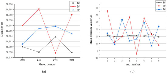 Grouping diameters and fit clearance values: (a) Diameter results for claw framework 1#, 2#, 3# (b) Predictive assembly means fit clearance values for 1#, 2#, 3#.