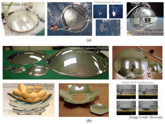 Literature survey of the reflectors made of polymer materials. (a) Inflatable balloon and antennas for ground tests and used in space, including the LOAD-series reflector model (image credit: ESA, Paris, France) [], IAE deployment tests in space (image credit: NASA, Washington, DC, USA), spherical inflatable membrane carried by small satellites (image credit: FreeFall Aerospace, Inc., Tucson, AZ, USA) [,]; (b) form-stiffened thin-shell prototypes with various forms of apertures and the deployment test (image credit: Mevicon, Inc., Mountain View, CA, USA) [,].