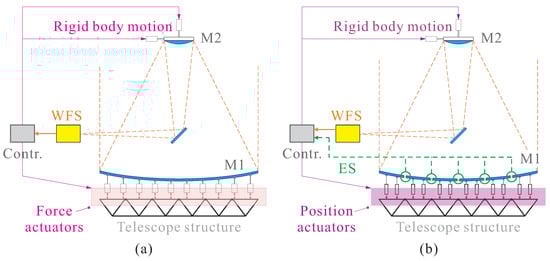 Fundamental principles and typical implementations of active optics (AO) in large telescopes. (a) Feedback AO implementation with force actuators on a ground telescope with a monolithic primary; (b) feedback AO implementation with position actuators on segmented mirrors. M1: primary mirror, M2: secondary mirror, WFS: wavefront sensor, ES: edge sensor.