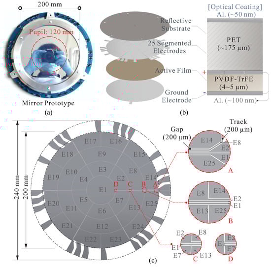 Thin shell composite with film actuators. (a) The mirror demonstrator; (b) the layers of the composite with a PET substrate and a thin film of PVDF-TrFE; (c) patterned electrodes [].