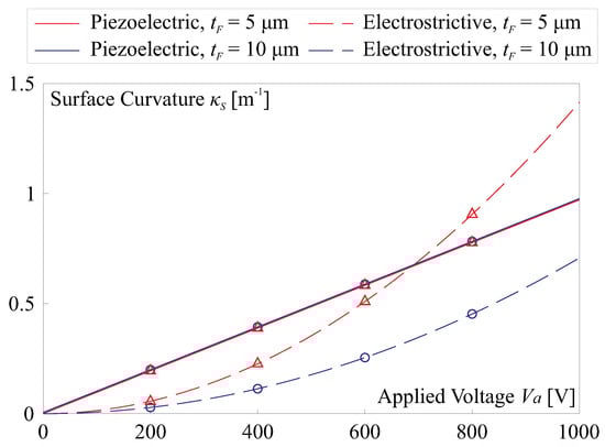 Surface curvatures induced by the piezoelectric and electrostrictive actuation with various thicknesses of the active film (m and 10 m); the results are computed using Equations (4) and (5), respectively. This numerical example uses experimentally calibrated data, as follows: GPa, GPa, , , m.