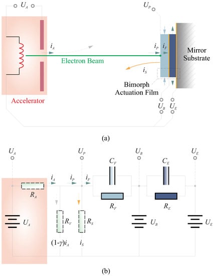 In this paper, we developed a model based on an equivalent circuit, rooted in the principles of charge conservation along the electron transmission pathway; although there is a lack of experimental verification, this study aims to propose a reasonable phenomenological model that awaits future experimental investigations for critical comparison. The implementation of the strain actuation process is depicted in Figure 5a, while the corresponding equivalent circuit is presented in Figure 5b (adapted from []). In this model, the electron gun is simulated as an accelerator consisting of a pair of cathode and anode, with an applied potential of to accelerate the electrons as they exit. In our design, the ferroelectric films are arranged in a bimorph configuration, as will be utilized in Section 4. The first layer serves to control micro-scale shape errors using the electron flux, with the strain regulation achieved through the surface potential and the backside potential . The second layer addresses macro-scale shape corrections, following the actuation approach outlined in Section 3.1, generating strain in relation to the potential difference (both and being controllable).