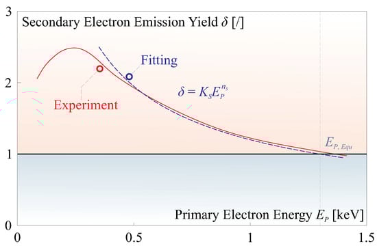 The electron flux that reaches the surface of the ferroelectric film carries a current denoted as . However, there is a loss of charge during this transmission, quantified by a factor of , i.e., . The total current at the input port of the film can be divided into two components: (1) the current that passes through the film, represented as , the film has a thickness of ; (2) the returning current, denoted as , which is a consequence of secondary electron emission. This secondary emission is influenced by the energy of the electrons impacting the surface . Estimations for can be performed using experimentally calibrated secondary electron yield relationships, often characterized by the parameter . These relationships are typically presented in the form of a curve. In the case of a thin film of PVDF, numerical fitting of this curve can be found in []. It can be mathematically expressed as and shown in Figure 6.
