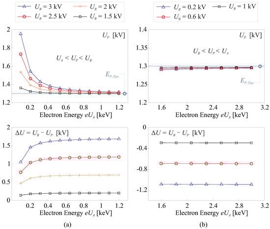 The first scenario occurs when , as illustrated in Figure 7a. Typically, the back pressure voltage is considerably higher than the potential of the electron gun . To implement control and adjust the potential difference , one can generally tune the energy of the electron gun , while maintaining a base supply of . Maintaining quasi-statically constant serves to simplify the control process and is also necessary since is also utilized to regulate the potential difference between the electrodes of the macro-patches. The second scenario, , illustrated in Figure 7b, presents a solution where is nearly constant and equals the equilibrium solution of . In this case, controlling the potential difference becomes straightforward, as it involves independently tuning . This approach is similar to the application described in [,].