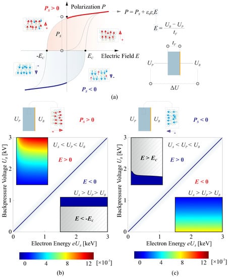 Quasi-static computation of the generated strain follows Equation (2). (a) The relationship of a ferroelectric material; (b) the generated strain resulting from a combined adjustment of both emission energy and backside voltage within the applicable range, the polarization direction exhibit a positive dipole orientation towards the backside; (c) the generated strain resulting from a combined adjustment of both emission energy and backside voltage within the applicable range, the polarization direction exhibit a positive dipole orientation toward the polymer surface encountering the electron flux.