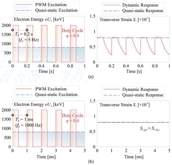 In this paper, a pulse width modulation (PWM) excitation signal is employed to adjust the input energy and generate strain levels equivalent to those achieved with quasi-static excitation. Numerical examples illustrating this dynamic excitation signal are presented in Figure 9. The dynamic excitation signal utilizes a PWM with the same energy as its quasi-static counterpart, and the excitation frequency should be determined to align with the specific requirements of the application. A general requirement for ensuring equivalence with the quasi-static scenario can be expressed as