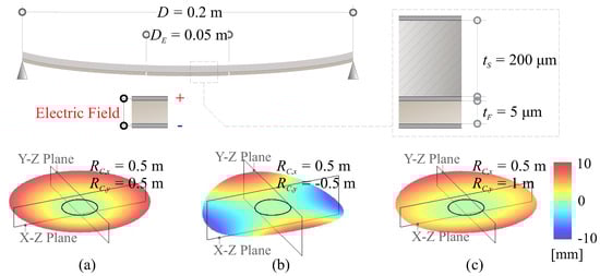 Figure 10 presents tested examples for numerical verification of strain morphing examination for a unimorph composite mirror. In these tests, a uniform potential is applied to the electrode. The composite reflector features a PET substrate of 200 m and a thin actuation film of 5 m. The mirror has a diameter of mm and is supported isostatically on the edge. The electrode size is mm.