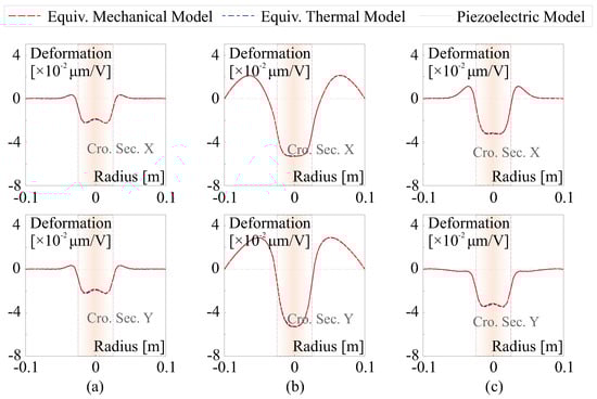 Three cases of biconic mirrors are examined, demonstrating perfect agreement between the strain actuation model and its mechanical and thermal equivalences, as shown in Figure 11. There is a notable behavior that can deteriorate the morphing performance in highly curved thin shells, leading to the print-through of the actuator. The quantitative criteria proposed in [] suggest that the print-through phenomenon will begin to appear if and become significant if (assuming ); e.g., in Figure 11a, where , we observe that the cross-section resembles the contour of the electrode superimposed with the fluctuated wavy shape on the edge.