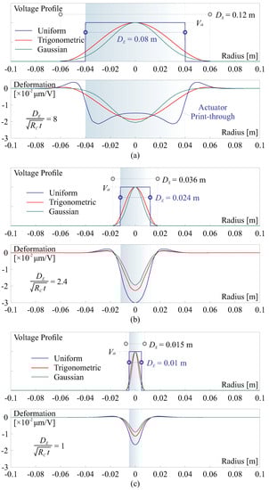 Figure 12 provides numerical examples illustrating the application of these two assumed profile functions with various influencing diameters () and compares the resulting deformation to that induced by a uniform field with the various electrode sizes of , the potential is applied on a thin-shell with the layers of Figure 10 and the RoC of m. For a general comparison, we can assume a fixed relation of , where is regarded as an equivalence of the spot area , it is common that indicating the spreading electron causes extra potential on the boundary; in these numerical tests, it is set by .