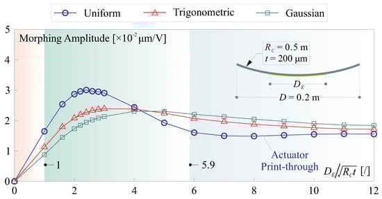 Figure 13 presents the change in morphing amplitude with respect to actuation size quantified by (and corresponding ), exhibiting a similar trend as observed in []. The results consistently show that the morphing amplitudes are limited, regardless of the driving method used. This limitation is normal, as it is primarily caused by the intrinsic stiffness introduced by the shape curvature. Specifically, excitation by the electron flux, which eliminates the problem of the print-through, is expected to correct high-frequency errors with low magnitudes (complied with the nature of a surface as described in [,]), as discussed in Section 4.