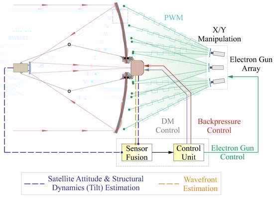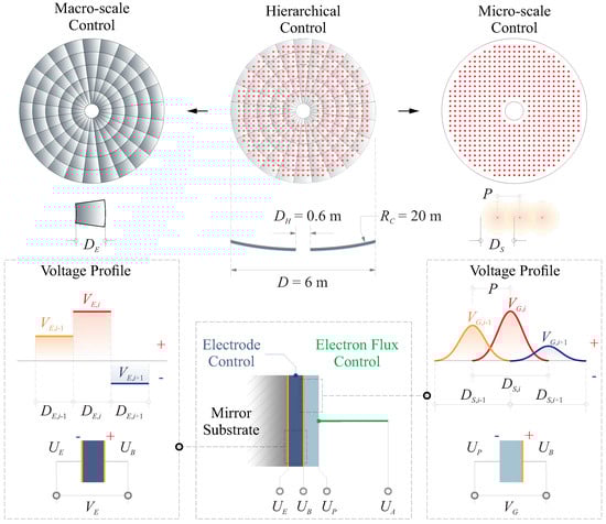 Figure 14 illustrates the schematic of this compound control method. It involves correcting shape errors of low-order modes (with low spatial frequencies) in thin-shell reflectors using an array of patterned actuators equipped with independent channels for voltage amplification. In the traditional approach, the number of channels required is determined by the equivalent size of the electrode relative to the geometric factor . However, this approach is not technically feasible for systems with a large number of controlled degrees of freedom (DoF). Instead, to address the difficulties in correcting high spatial frequency shape errors, the morphing method considers exciting the active thin film with an electron flux with modulated power, while also adjusting the potential on the backside. This approach is aimed at compensating errors that may arise from factors like the manufacturing process, internal stress release, or residual errors from previous control stages.