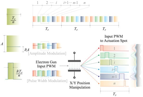 In Figure 16, we propose a baseline design that involves assigning the emitted power of the electron flux. In this approach, one actuator (the electron gun) is assumed to control a number of actuation nodes (denoted by n), generating interacting morphing spots to correct micro-scale errors. This design is inspired by the simulated work shown in Figure 9. In one period of the dynamic signal, the actuation time slots are divided into n segments. For the node, this division should be further multiplied by a factor of . Therefore, the overall duty cycle for the actuation spot is . The core issue of this control method is to set an appropriate value of the frequency . This frequency should be high enough with respect to electrical resonances, as detailed in Equation (9). It should also be far enough from the mechanical amplification caused by the structural dynamics, which is commonly lower than the electrical resonant frequency, as surveyed by empirical estimates in []. It is worth noting that with this method, the physical complexity of implementing the exciters for the thin-film actuators can be significantly reduced. The value of n is determined by the output power of the electron gun, and can be determined through mechanics computation or experimental calibration. In practice, in case of the actuator saturation, an array of the electron guns might be optimally organized. In this study, although there are certainly more flexible methods for distributing power to the actuation nodes to morph the active reflector, we emphasize the principle with this simplest implementation.
