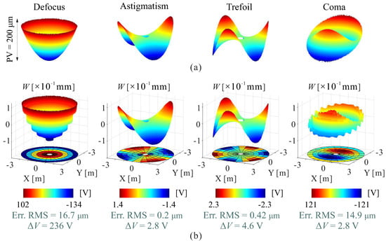 Numerical tests on evaluating the morphing capability of correcting primary optical errors of a surface. (a) target shapes of tested modes; (b) resulting shapes and voltage maps.
