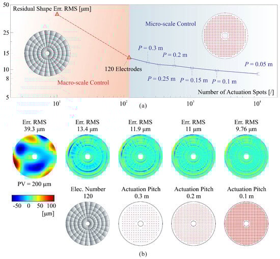 In this paper, we present the simplest implementation of the hierarchical control algorithm discussed earlier, assuming perfect optical wavefront sensing. Our setup features an active spherical reflector with a diameter of m (with a central obstruction of 10%) and a radius of curvature m. The design of the polymer material layers follows the numerical example depicted in Figure 10. In the first step of the hierarchical control process, we employ a macro-scale control strategy utilizing a Keystone pattern of electrodes. These electrodes have a dimension of , where represents the length of the sector electrodes evenly distributed along the radial direction. This array design provides us with 120 independent control degrees of freedom (DoFs), as illustrated in Figure 14. The second step of our shape refinement process involves using a tunable electron flux to correct micro-scale errors in the shape. In this method, we create a typical actuator pattern in Cartesian coordinates using a scanning mechanism. These actuation spots are separated by a pitch dimension denoted as P. Currently, without critical experimental verification, we approximate the resulting morphing shape with a Gaussian profile having an influencing size of . We assume that this dimension is linearly related to P by a factor of , where due to interactions among adjacent actuator nodes. The charging architectures of the thin film are illustrated at the bottom of Figure 14.