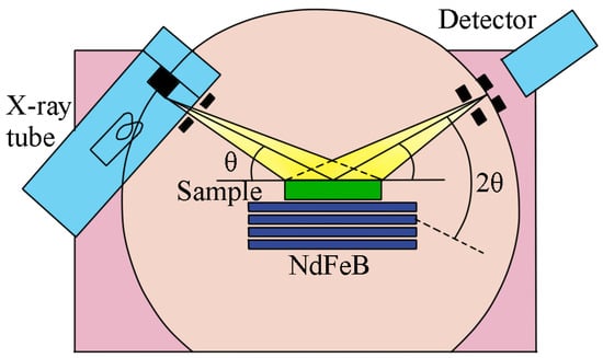 Schematic of the experimental setup for XRD. By stacking NdFeB magnets, magnetic fields of up to 2500 Oe were generated. The direction of the magnetic inductance lines is perpendicular to the X-ray scan surface.