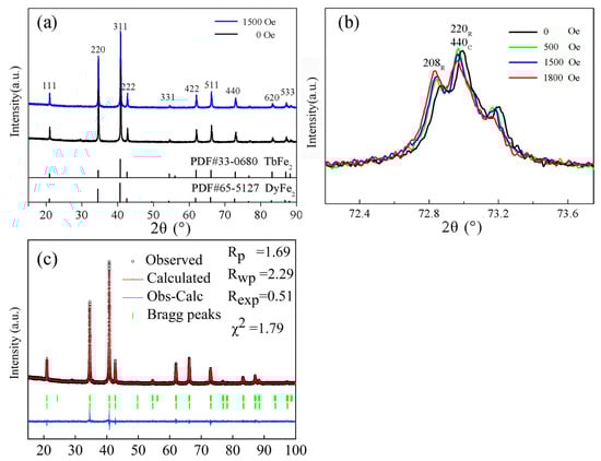 XRD patterns of the Tb0.29Dy0.71Fe1.95 sample under different magnetic fields. (a) XRD patterns at magnetic fields of 0 and 1500 Oe using a cubic structure index, compared with standard PDF cards. (b) The peak shape at 2θ = 73° formed by the superposition of rhomboidal and cubic structure peaks, and the intensity of the small peak on the right is half of the (220R + 440C) peak, indicating the Ka2 diffraction peak, which had no influence on the analysis. (c) Plot of the Rietveld refinement of the XRD diffraction pattern recorded at 1500 Oe. The first and second rows of green Bragg peaks refer to the hexagonal and cubic types of Tb-Dy-Fe, respectively.