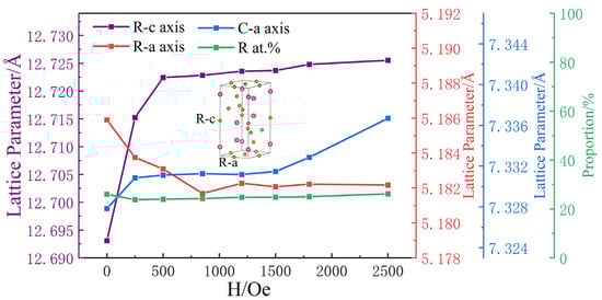 Similar to how a magnetic domain is deflected in the direction of the magnetic field [32], the lattice is also deflected in the direction of the magnetic field. We found that this process is reversible and repeatable through the process of magnetostrictive coefficient measurement. Therefore, we think that the increase in the magnetostriction coefficient in the magnetic field at 500 Oe–1500 Oe is due to the gradual rotation of the R-c direction of the rhombohedral lattice; the R-c whose initial direction is not in line with the magnetic field direction gradually shift to the magnetic field direction. This rotation process may continue until the magnetic field exceeds 2500 Oe and approaches the saturation magnetic field. The linear magnetostriction for high magnetic fields is mainly caused by rotation, and the rate of magnetostriction gradually decreases with the increase in the magnetic field. Since the main change occurring after the magnetic field intensity exceeds 2000 Oe is the growth in the cubic lattice parameter C-a, and it is thought that 2000 Oe can overcome the barrier of continued expansion of the cubic lattice, volume magnetostriction [33] may begin at this point. We note that the proportions of the rhombohedral structure and cubic structure hardly change, so the change in lattice parameters is the main factor in this magnetization process.