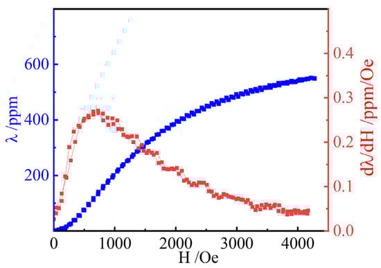 Dynamic magnetostriction (d33) was calculated using dλ/dH, as shown by the red curve in Figure 4. The higher the value of dλ/dH, the lower the field needed to trigger large magnetostriction, and the more sensitive the sample deformation to the magnetic field. In practical applications, the Tb-Dy-Fe alloys with a higher dλ/dH can help realize the miniaturization of devices. The largest dλ/dH appears at about 700 Oe and reaches the maximum value of 0.3 ppm/Oe. In the range of 500 Oe–900 Oe, dλ/dH maintains a relatively large value. When the rhomboidal structure begins to rotate, the sample deformation is most sensitive to changes in the magnetic field. It can be deduced that the highest contribution efficiency of rhomboidal lattice deformation to magnetostriction occurs after the beginning of rotation. When the magnetic field exceeds 700 Oe, the dλ/dH value slowly decreases from the highest value. This is because rhombohedral structures with certain favorable angles to the direction of the magnetic field rotate preferentially, and rhombohedral structures with other angles rotate successively after the magnetic field continues to increase. This results in a departure from the linearity of the response of the lattice strain to the applied magnetic field and easily increase the saturation magnetic field. If there are regulatory measures to make the R-c direction of all rhomboid cells rotate at the most favorable rotation position in the beginning and rotate together after reaching 500 Oe, the saturation magnetic field greatly reduces and the dλ/dH increases. This topic clearly needs further study.