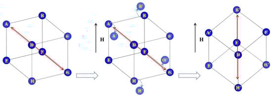 The lattice parameters of both the rhombohedral and cubic structures did not significantly change between magnetic field intensities of approximately 500 Oe and 1500 Oe. However, the magnetostriction coefficient of the powder-bonded sample still increased with increasing magnetic field intensity, as shown by the blue curve in Figure 4. Therefore, we propose that the orientation of the rhombohedral crystal structure is arranged in different directions and can rotate under the action of a magnetic field. This view can be confirmed in Figure 2c, where the relative strength of rhombohedral peak 208R and (220R + 440C) peaks varies in a magnetic field with a ratio of 0.73 at 500 Oe and 0.80 at 1500 Oe. Since the results of the Rietveld refinement show that the ratio of rhomboidal structure to cubic structure remains unchanged, that is, the relative strength of the 440c peaks does not change, the relative strength of the 208R and 220R peaks should change in the magnetic field, which means that the Rhomboidal structure is oriented in the magnetic field. However, the crystal cell does not actually rotate, according to the principle of energy minimization [6,12]; but, through the displacement of atoms to a nearby position by overcoming the lowest barrier, the direction of extension of the crystal lattice is rotated, as shown in Figure 5. The rhombohedral c-axis elongation in the sample may be along any direction in the initial phase. When the direction is inconsistent with the magnetic field H, with increasing magnetic field, the atoms overcome the barrier and move towards a nearby position. In Figure 3, the atoms in positions A, G, B, and H move towards positions A′, G′, B′, and H′, respectively. After all the atoms (including atoms in the C, D, E, and F positions) have moved to new equilibrium positions, the elongation direction of the cell is rotated from the initial AG direction to the H′B′ direction, which is parallel to the magnetic field. The rhombohedral cell “rotation”, in this way, mainly contributes to the magnetostriction phenomenon for 500–1500 Oe magnetic fields.