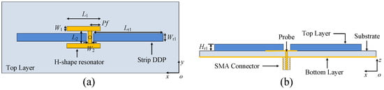 In order to be able to excite two strip DDP resonators at the same time, an H-shape resonator was designed for power distribution. Figure 5 exhibits the configuration of the H-shape resonator, which consists of an H-shaped metal strip, the substrate and the ground. The four modes of the H-shape resonator in odd- and even-mode analysis are exhibited in Figure 6, which are named as odd–even mode, even–odd mode, odd–odd mode and even–even mode, respectively. It can be seen that the even–odd mode and the odd–odd mode of the H-shape resonator can be used to excite the TMδ1 mode and the TMδ2 mode of the strip DDP resonator. This is because the electric field distributions at the left and right arms of the even–odd and the odd–even modes are both out-of-phase at different resonant frequencies. Additionally, as the electric field strengths at the left and right arms of the even–odd mode are similar, it can excite the two strip DDP resonators equally.