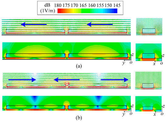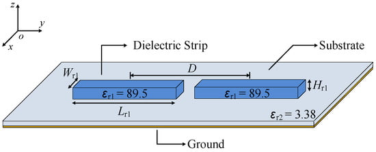 Figure 2 shows the configuration of two strip DDP resonators, which consists of two dielectric strips with a high relative permittivity (εr1 = 89.5), the substrate with a low relative permittivity (εr2 = 3.38) and the ground. The above configuration is used for mode analysis by the Eigenmode solver in CST to explore the method of exciting two strip DDP resonators at the same time. The vector and average magnitude electric field distribution of two strip DDP resonators are exhibited in Figure 3a,b, respectively. In Figure 3a, each strip DDP resonator shows the fundamental TMδ1 mode, and there is no electric field phase difference between the two DDP resonators, which can be superimposed in the boresight direction for radiation. In Figure 3b, each strip DDP resonator shows the TMδ2 mode, while the electric field phase difference between two strip DDP resonators is 180 degrees, which can be canceled at the boresight direction for the radiation null.