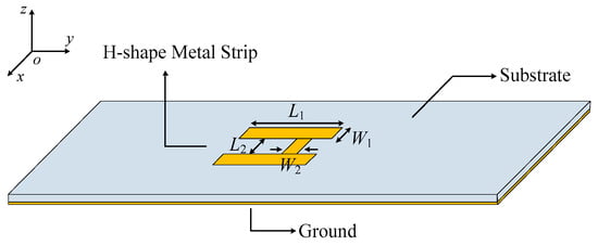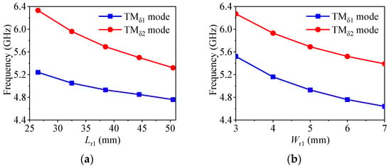 - By setting fTMδ1 to f0, the initial dimensions Lr1, Wr1 and Hr1 of the strip DDP resonator can be obtained from the variation law in Figure 4. The frequency of the even–odd mode for the H-shape resonator needs to be set at f0 and its initial parameters L1 and L2 can be determined from this. The initial parameters W1 and W2 can be determined based on the matching of the antenna array.
