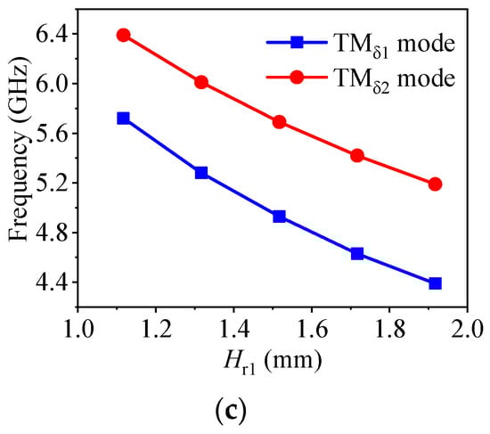 Figure 4 exhibits the variation of the resonant frequencies for the TMδ1 mode and the TMδ2 mode in the strip DDP resonator under different parameters. It can be seen in Figure 4a that, with the increase in Lr1, the resonant frequencies for the TMδ1 mode and the TMδ2 mode decrease, and the distance between the two modes reduces accordingly. Figure 4b indicates that resonant frequencies of TMδ1 and TMδ2 modes also show a decreasing trend with an increase in Wr1, and the distance between the two modes is almost unchanged. Finally, as shown in Figure 4c, as Hr1 increases, the resonant frequencies decrease quickly, and the distance between the two modes increases. Therefore, the resonant frequencies for the TMδ1 mode and the TMδ2 mode in the strip DDP resonator can be controlled by the values of Lr1, Wr1 and Hr1.