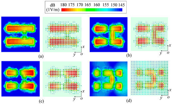 The vector and average magnitude electric field distribution of four modes of the H-shape resonator (L1 = 16.5 mm, W1 = 2.5 mm, L2 = 6.2 mm, W2 = 1.7 mm). (a) Odd–even mode (2.71 GHz). (b) Even–odd mode (4.87 GHz). (c) Odd–odd mode (5.74 GHz). (d) Even–even mode (9.09 GHz).