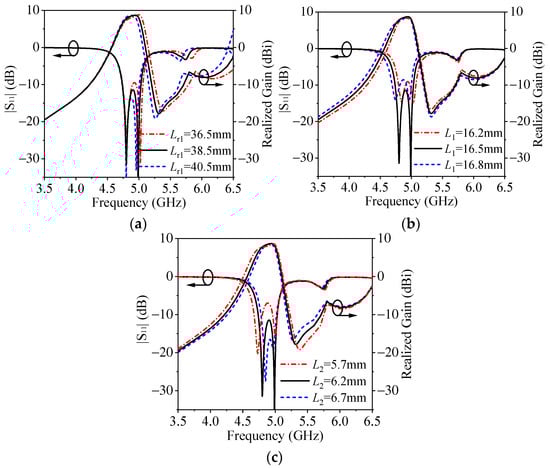Figure 7b indicates that when L1 increases, the first reflection zero moves down accordingly. The reason is that the even–odd mode of the H-shape resonator decreases with the increase in L1. Figure 7c shows that with the increase in L2, the bandwidth decreases and the upper-edge radiation null shifts down. This is because when L2 increases, the coupling between the H-shape resonator and the DDP resonator decreases, and the resonant frequency of the odd–odd mode of the H-shape resonator decreases.