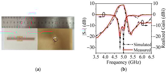 To verify the design, a prototype at 4.9 GHz, as shown in Figure 8a, was designed, fabricated and measured. According to the design procedures, the detailed dimensions of the antenna are: Gl = 98 mm, Gw = 48 mm, Lr1 = 38.5 mm, Wr1 = 5 mm, Hr1 = 1.5 mm, L1 = 16.5 mm, W1 = 2.5 mm, L2 = 6.2 mm and W2 = 1.7 mm.