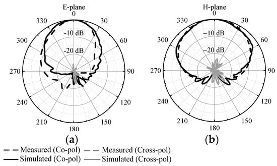 Figure 9 exhibits the simulated and measured radiation patterns at 4.9 GHz. The measured 3 dB beamwidth is 46°/90° in the E/H-plane, the measured front-to-back ratio is above 20 dB in the E/H-plane and the measured cross polarization level is below −25 dB/−23 dB in the E/H-plane.
