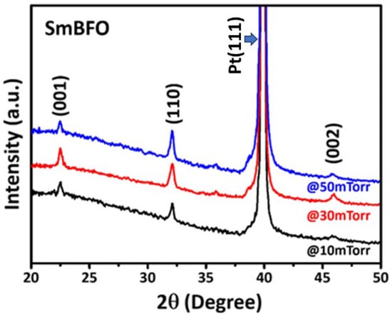 Figure 1 shows the XRD patterns of SmBFO thin films deposited at various PO2 of 10 mTorr, 30 mTorr, and 50 mTorr. It is noted that the XRD patterns shown in Figure 1 have been intentionally shifted along the y-axis with a constant distance in order to clearly compare the relative intensities and positions of the relevant diffraction peaks. All of the diffraction peaks can be indexed as a single rhombohedral phase of BFO [], indicating that doped Sm3+ ions should have been incorporated well into the BFO crystal structure by replacing the Bi sites. This result is consistent with that reported in Ref. [], in which it was asserted that the partial substitution of Bi3+ ions with slightly smaller Sm3+ ions did not show a noticeable effect on the crystal orientation of BFO thin films. Therefore, the SmBFO thin films investigated in the present work can be regarded as homogenous, and the strain effect might be neglected due to the small atomic radius difference between Bi3+ (1.15 Å) and Sm3+ (1.08 Å).
