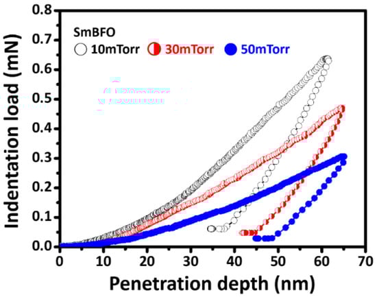 Generally, to avoid the substrate effect on the determination of the hardness and Young’s modulus of SmBFO thin films, the indentation depth should not exceed 30% of the film’s thickness []. In the present study, the film’s thicknesses were approximately 300 nm, and thus, we applied the maximum penetration depth below 70 nm (corresponding to 23.3% of the film thickness) to ensure that the substrate effect can be neglected. Figure 3 shows the typical CSM P-h curves for the SmBFO thin films deposited at various PO2. Akin to the stress–strain curve obtained in the usual mechanical property tests, the P-h response obtained through nanoindentation contains elastic and plastic deformation due to the compressive indentation. Thus, it can be regarded as indices of the mechanical properties within nanoscale regions. All P-h curves obtained for the SmBFO thin films appear to exhibit a rather smooth behavior. Indeed, the absence of any discontinuities along either the loading (the so-called “pop-in” event) or unloading (the so-called “pop-out” event) segment indicates that neither the occurrence of fracture nor a pressure-induced phase transition is involved here. That is, this result is in sharp contrast to the observation of a fracture or/and cracking phenomenon in the hexagonal-structured HoMnO3 thin films [] and ZnO thin films [] and the phase transformation behaviors observed in Si [,] and Ge [] single crystals during nanoindentation.