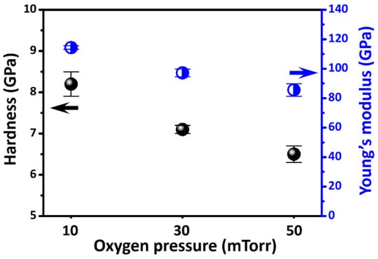 Among the rare-earth-doped BFO systems, the Sm-doped BFO (SmBFO, Bi1−xSmxFeO3) thin film has received particular research attention due to its unique structural transition over a relatively narrow concentration range at room temperature. SmBFO has been reported to exhibit a phase transition from the ferroelectric rhombohedral phase to the antiferroelectric orthorhombic phase with an increasing Sm doping amount. The morphotropic phase boundary appears in the vicinity of x = 0.13~0.15. In particular, anomalous high values of the out-of-plane piezoelectric coefficient (~110 pm V−1) and an enhanced dielectric constant at x = 0.14 are reported in such a system []. On the other hand, by studying a series of Bi1-xSmxFeO3 thin films (x = 0.05–0.16) deposited using PLD, it was found that the 10 at% Sm-doped BFO thin films could result in films with an extremely fine grain structure and smooth film/substrate interface, which, in turn, gave rise to the largest remanent ferroelectric polarization as compared to films prepared under similar conditions but with different Sm doping concentrations []. Following the interesting observations from a previous study [], the present work focuses on investigating the nanomechanical properties of a series of 10 at %-doping SmBFO thin films grown on Pt-coated glass substrates by using PLD at the substrate temperature of 600 °C under various oxygen partial pressures (PO2). The effects of PO2 on the film’s microstructure, surface morphology, and mechanical properties are studied by means of X-ray diffraction (XRD), scanning electron microscopy (SEM), and nanoindentation techniques. This study provides insights into the correlation between the nanomechanical properties and the microstructures and crystallite sizes of the SmBFO thin films grown at various PO2.