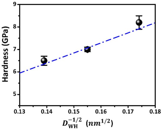 The relation of hardness and crystalline sizes (DWH) of SmBFO thin films. The dash-dotted line is the fitting line using Hall–Petch equation.
