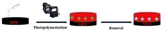 The proposed ACR-ZDV-MIP/GCE sensor was developed on GCE by copolymerizing ACR and HEMA with crosslinking EGDMA in the existence of ZDV. Under optimum conditions, the developed ACR-ZDV-MIP/GCE sensor was fabricated by keeping it under a UV lamp at room temperature (Figure 1). After confirming the presence of the film formed on the electrode surface, a Thermo Shaker was used for 5 min to remove the template molecule ZDV.