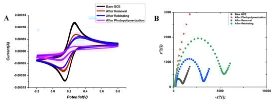 (A) CV and (B) EIS results of bare GCE after PP, after removal treatment and after rebinding of ZDV in 5 mM [Fe(CN)6]3−/4− solution (0.1 M KCl).