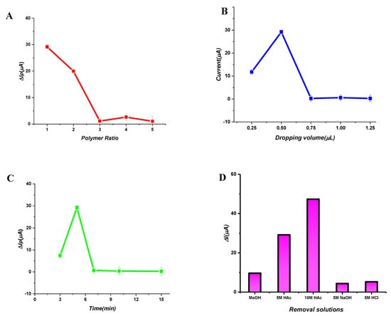 The ACR-ZDV-MIP/GCE sensor was obtained using a UV lamp with a wavelength and power density of 365 nm and 100 W, respectively. Optimizing the PP time under a UV lamp forms a stable polymeric film on the GCE surface. After 0.50 µL of polymerization solution was dropped onto the GCE surface, it was exposed to UV light for 3–15 min. Then, the differences in the peak currents after removal and after PP were compared. Considering that the sensor preparation time must be ideally short, 5 min of UV light exposure was chosen as the optimum polymerization time (Figure 3C).