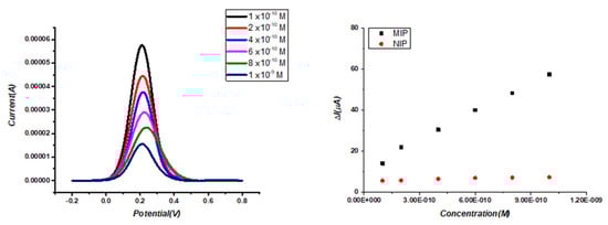 The analytical performances of the ACR-ZDV-MIP/GCE sensor were evaluated using different concentrations of ZDV in a standard solution under optimum conditions. The linearity range was between 1.0 × 10−10 and 1.0 × 10−9 M using the DPV technique in 5.0 mM [Fe(CN)6]3-/4- solution. DP voltammograms and linear curves of this sensor were given in Figure 4A. A linear curve was obtained using ΔI values versus different ZDV concentrations. The calibration equation of the ACR-ZDV-MIP/GCE sensor was found as ΔI = 5.0 × 1010 × C + 11.247 (r = 0.995) (Table 3). C is the concentration of ZDV. LOD and LOQ values were calculated using the formulas 3× s/m and 10× s/m (s: standard deviation, m: slope) and were determined as 1.63 × 10−11 and 5.42 × 10−11 M, respectively.