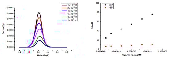 The analytical performances of the ACR-ZDV-MIP/GCE sensor were tested with NIP sensors prepared in the absence of ZDV in Figure 4B. The results showed that the developed sensors have excellent sensitivity to detect ZDV.