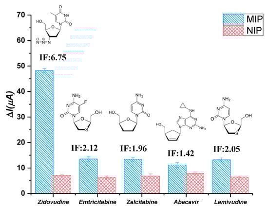 One of the characteristics of an ideal sensor is its selectivity toward other species. To evaluate the selectivity of the developed sensor, the electrochemical responses of MIP and NIP electrodes for ZDV and other substances were examined using the DPV technique, and the obtained results are presented in Figure 6. The selectivity of the interfering species was measured intuitively using the imprinting factor (IF) = ΔI(MIP)/ΔI(NIP). ZDV exhibited an IF value of 6.75, as shown in Figure 6, while the other interfering species had IF values between 2.12, 1.96, 1.42 and 2.05 for Emtricitabine, Zalcitabine, Abacavir and Lamivudine, respectively. The results indicate that the proposed electrochemical sensor is more selective and sensitive to ZDV molecules than to other interfering species. The ability of the MIP layers to selectively identify target analytes was excellent, and the selectivity of the proposed sensor was found to be sufficient.