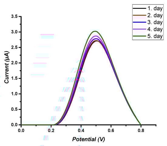 Storage stability experiments indicated the applicability and reusability of the ACR-ZDV-MIP/GCE sensors. As a result of these experiments, it has been discovered that effective results can be obtained in up to 5 days (Figure 7).