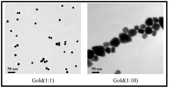 The materials in this study were synthetic silicone monomer (SID-OH) with a hydroxy attached structure to polydimethylsiloane, N,N-dimethylacetamide (DMA), ethylene glycol dimethacrylate (EGDMA) as a crosslinking agent, and 2-hydroxy-2-methylpropiophenone (2H2M) as a photoinitiator. All reagents used were Sigma Aldrich products. In addition, gold nanoparticles of various sizes synthesized at an aspect ratio of 1:1 to 1:10 were used as additives, and products from Fine Nano Co., Ltd. (Suwon, Republic of Korea) were used. The Transmission Electron Microscope (TEM) image of the gold nanoparticles used in this study is shown in Figure 1.