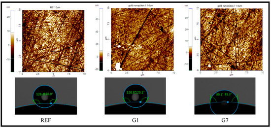 To analyze the surface of the manufactured lens, contact angle, AFM, and SEM were measured. The contact angle was measured to confirm the wettability of the manufactured lens; the results show that REF was 126.74°, G1 to G7 were 120.47 to 80.56°, and G10 was 100.50°. As the aspect ratio of the gold nanoparticles increased, the wettability was improved due to the lower contact angle, but the contact angle of the lens with of 1:10 gold nanoparticles slightly increased, similar to the result of the water content. The contact angle measurement graph and image are presented in Figure 4.