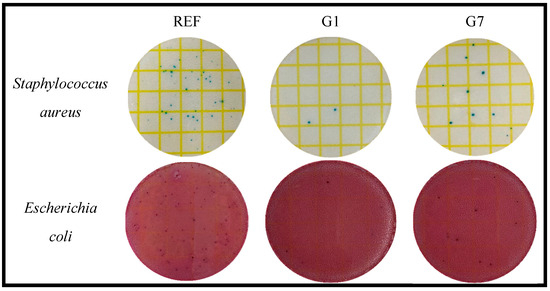 In order to confirm the antibacterial properties of the prepared lenses, their effects against Staphylococcus aureus and Escherichia coli were confirmed using 3M PetrifilmTM, a dry film medium. For the antibacterial test, the prepared lens and physiological saline were added and shaken, then 1 mL of the solution was taken and smeared on 3M PetrifilmTM, a dry media film. The plated dry film medium was incubated for about 24 h in an incubator at 35 ± 1 °C, and the antimicrobial effect against each microorganism was confirmed. As a result of the measurement, it was confirmed that numerous microorganisms grew in the medium of REF, which was a control group. On the other hand, all the samples to which the gold nanoparticles were added had excellent antibacterial properties regardless of the type of microorganism. In particular, the antibacterial properties were the highest in the G1 group and slightly lower in the G7 group. The antibacterial properties were inversely proportional to the surface roughness values of AFM. Except for REF, the antibacterial properties of gold nanoparticles are related to the surface roughness of the lens [9,16], and it is believed that the surface roughness interferes with the attachment of microorganisms and thus has a difference in antibacterial properties. The results of antibacterial activity against Staphylococcus aureus and Escherichia coli are presented in Figure 7.