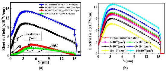 The vertical electric field for SiC/Si VDMOS, Si VDMOS, and SiC VDMOS are shown in Figure 2a. For SiC VDMOS, BV reached 1747V. For Si VDMOS, when X = 2.5 μm (shown in Figure 1), the maximum field strength was 3.03 × 105 V/cm (reaching the critical breakdown electric field of Si materials), and BV was 259 V of Si VDMOS. For SiC/Si VDMOS, when the drain voltage reached 259 V, the electric field strength at the interface between the P-base and the N-type drift regions did not reach the critical breakdown field strength of SiC, so the device did not break down. As the drain voltage was further increased, the electric field strength of the device increased until the electric field at the heterojunction reached 3.45 × 105 V/cm (reaching the critical breakdown field of the Si materials), and the SiC/Si VDMOS broke down. Therefore, the BV of SiC/Si VDMOS was increased from 259 V to 1144 V compared with the conventional Si VDMOS [16,17]. According to previous experimental results [23,24], SiC/Si interfacial charges were introduced during the direct bonding process. The effect of different interface state charge concentrations on the vertical electric field of SiC/Si VDMOS is shown in Figure 2b. The type of interface state charge introduced was donor (electron) or acceptor (hole) in this paper. An increase in the interface state charge (acceptorlike) concentrations resulted in an increase in the vertical electric field of the SiC/Si VDMOS compared with SiC/Si VDMOS without an interface state charge. This is because of the p-type trap layer introduced by the interface charge (acceptor) at the SiC/Si heterojunction, which enhanced the internal electric field at the SiC/Si interface and changed the distribution of the electric field. As the interface state charge (donor) concentration increased, the vertical electric field at the SiC/Si heterojunction decreased.